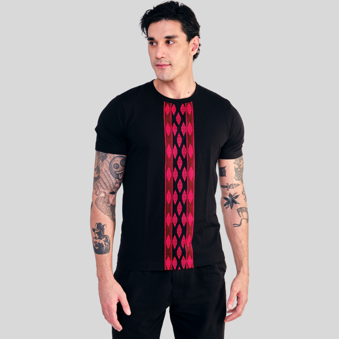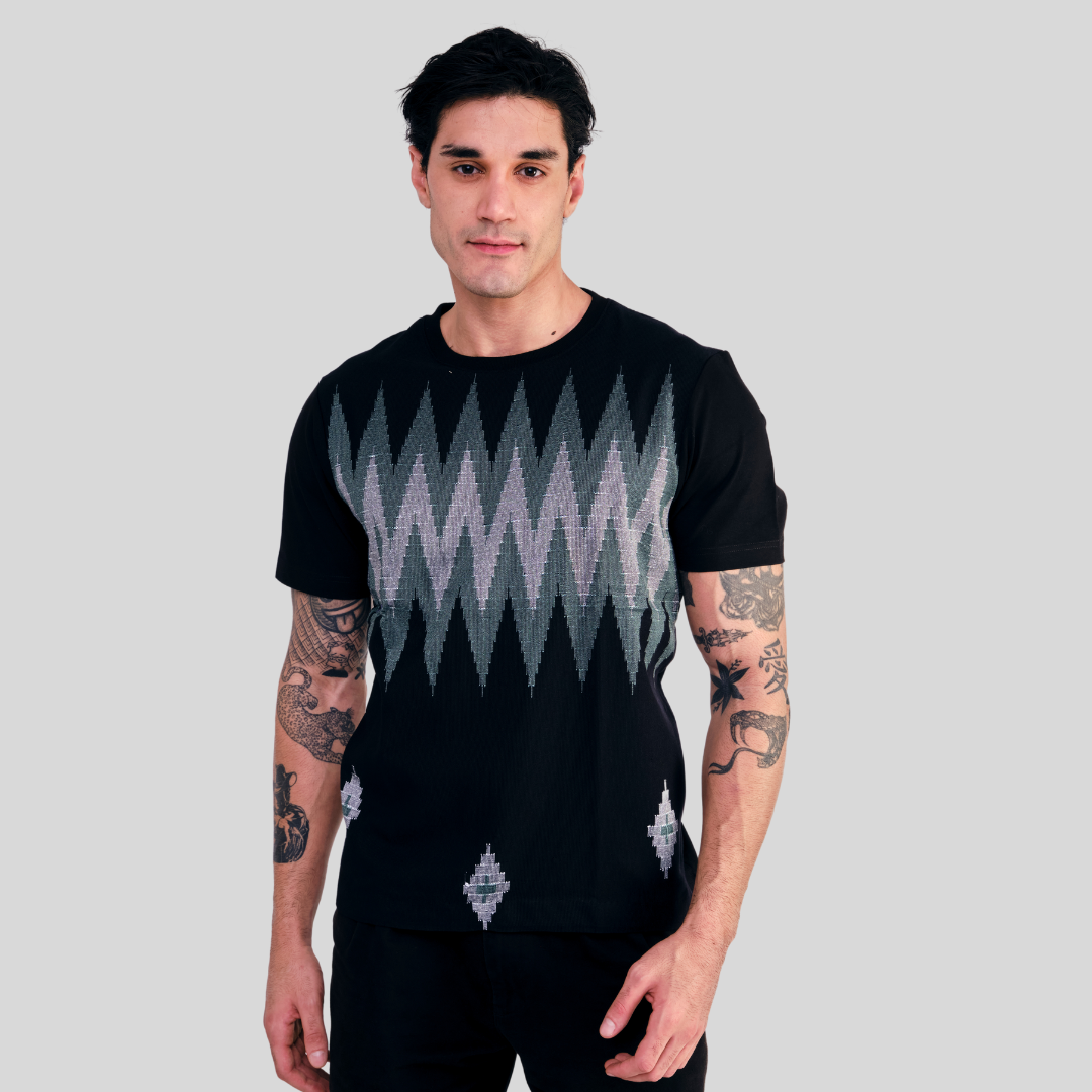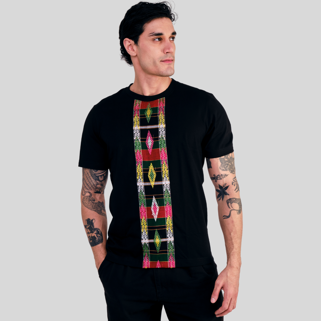 Robin T-shirt features a bold vertical panel of Burmese ethnic fabric featuring vibrant geometric patterns in rich colors like green, red, yellow, and pink. Set against a classic black base, this design marks traditional craftsmanship while offering a striking modern aesthetic. Perfect for adding a cultural edge to your everyday wardrobe.